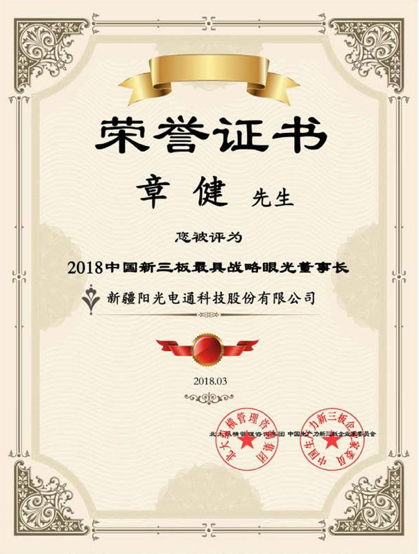 中國新三板最具戰(zhàn)略眼光董事長榮譽(yù)證書